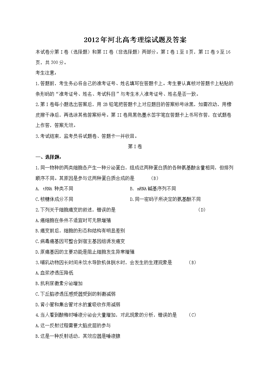 【文档预览】 无忧考网整理发布2012年河北高考理综试题及答案(Word版),前五页预览如下: