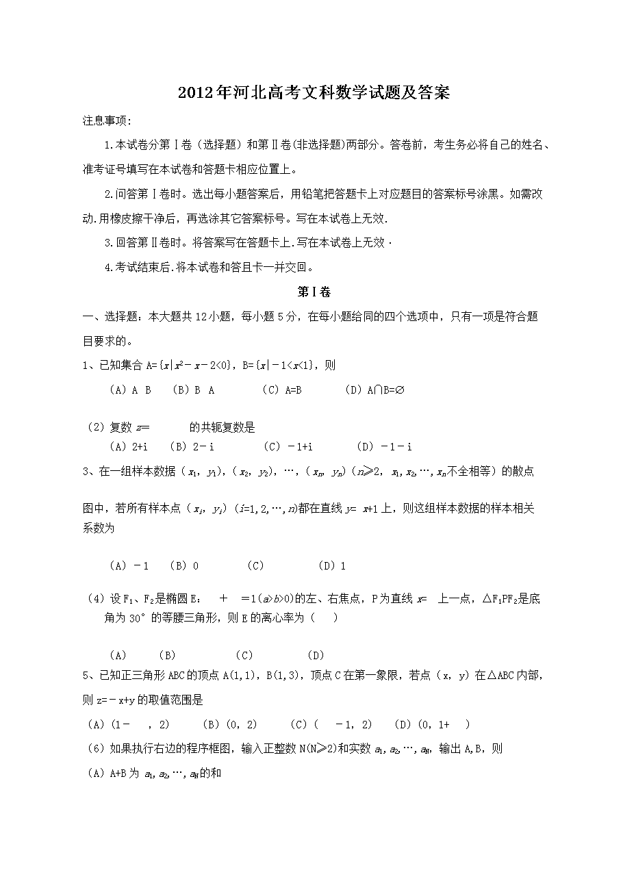 【文档名称】 2012年河北高考文科数学试题及答案(Word版).doc