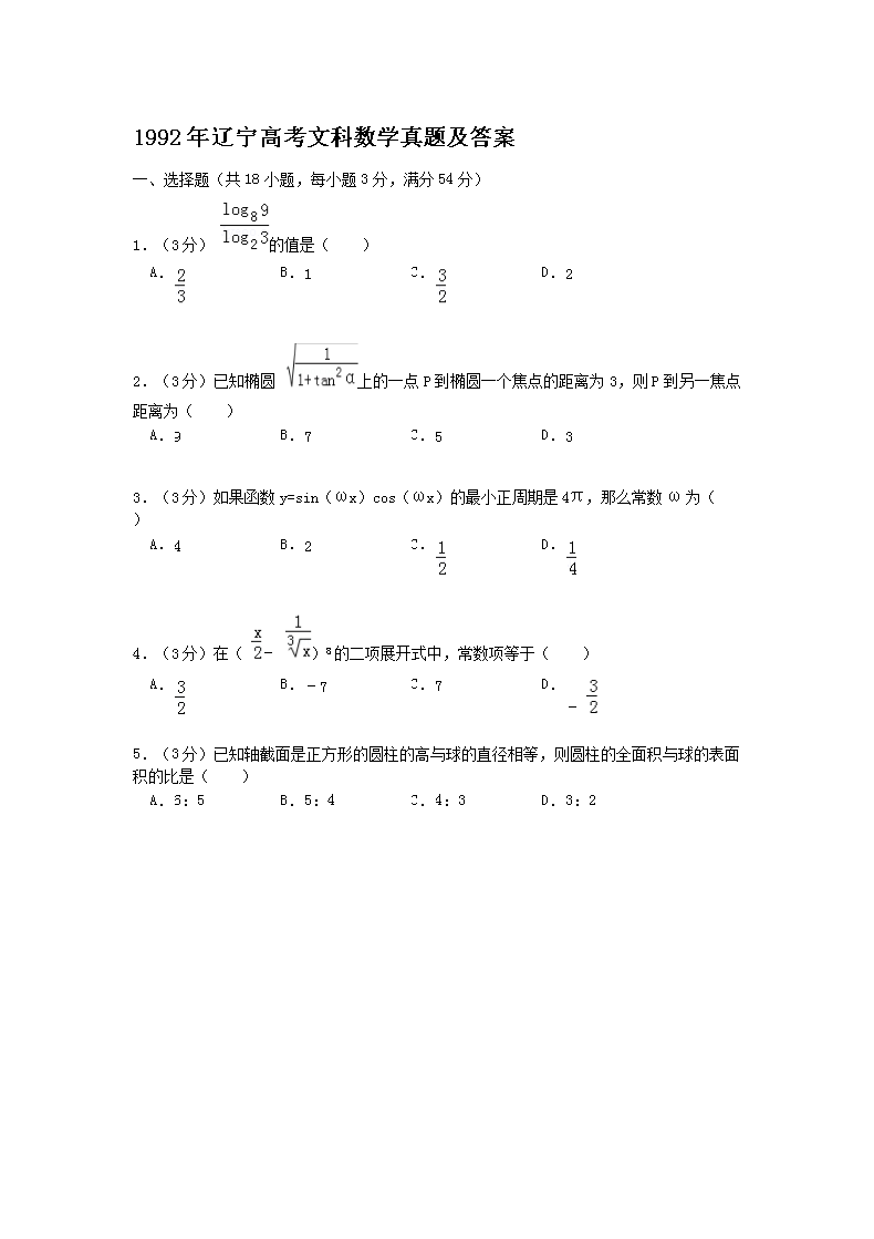 【文档名称】 1992年辽宁高考文科数学真题及答案(Word版).doc