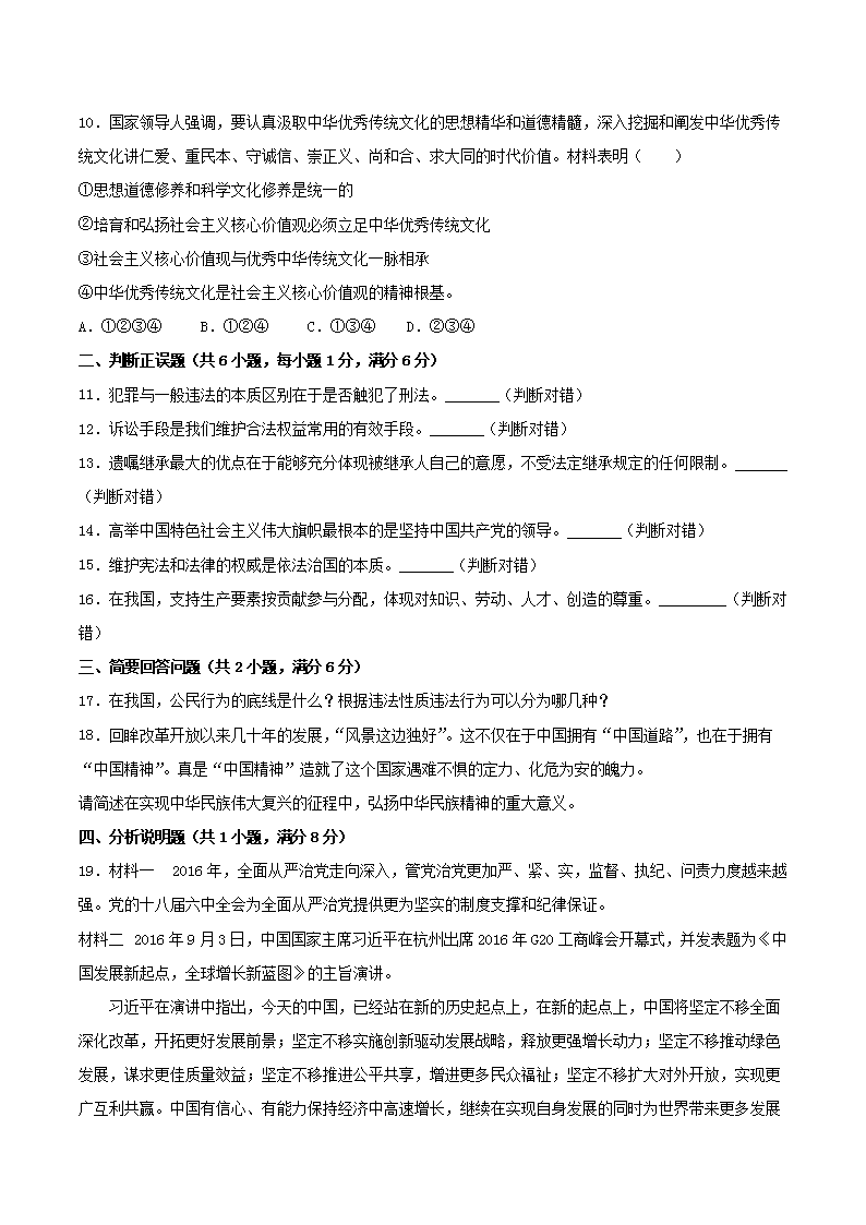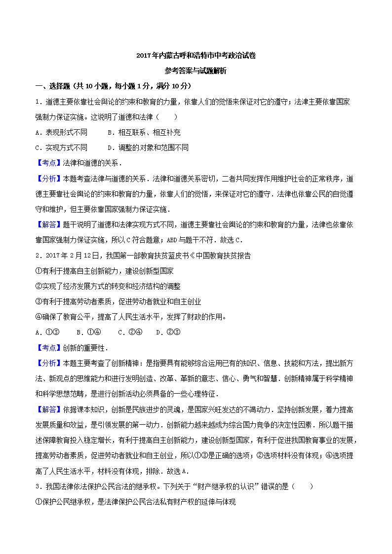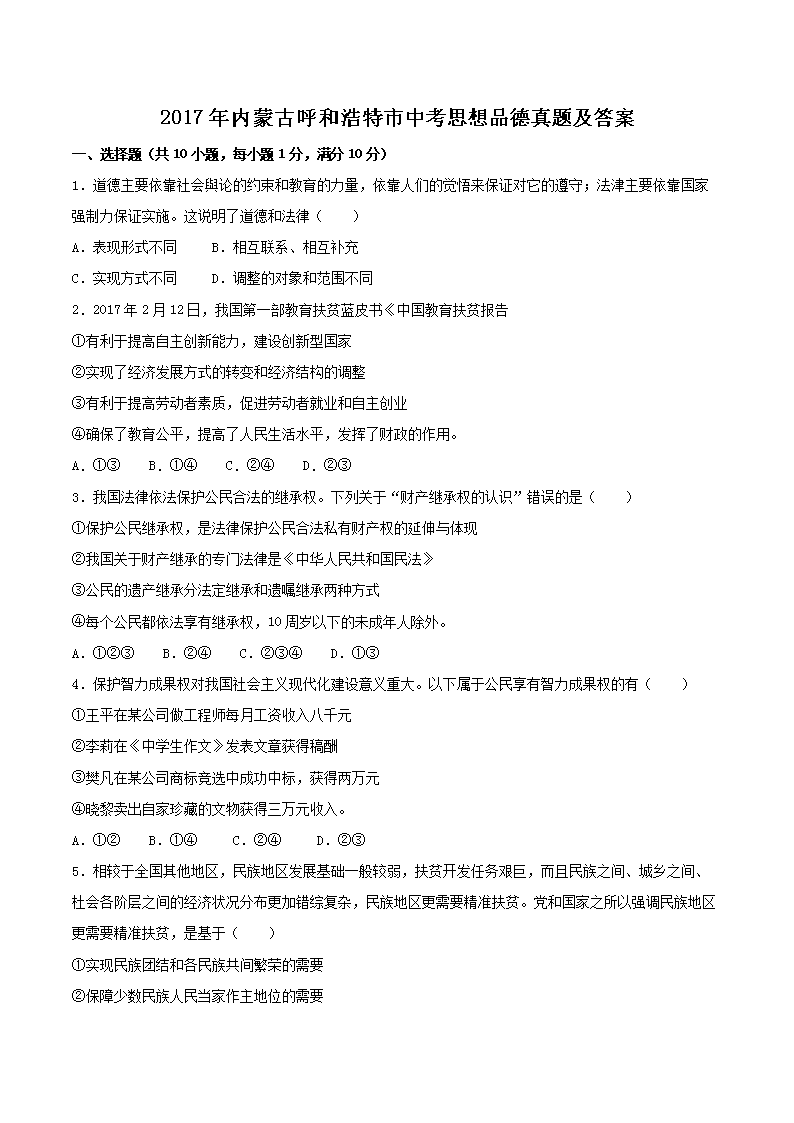 【文档名称】 2017年内蒙古呼和浩特市中考思想品德真题及答案(Word版).doc