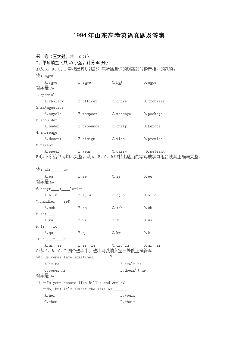 【文档名称】 1994年山东高考英语真题及答案(Word版).doc