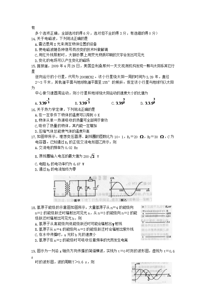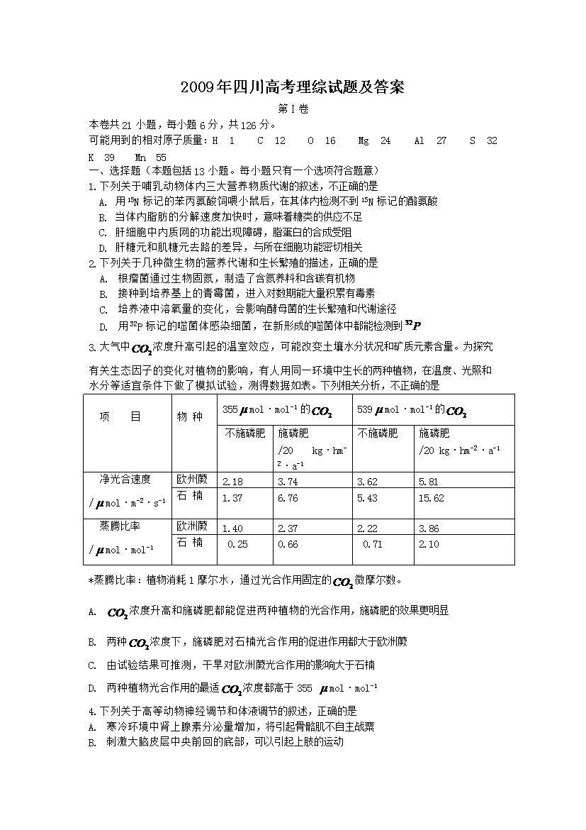 【文档名称】 2009年四川高考理综试题及答案(Word版).doc