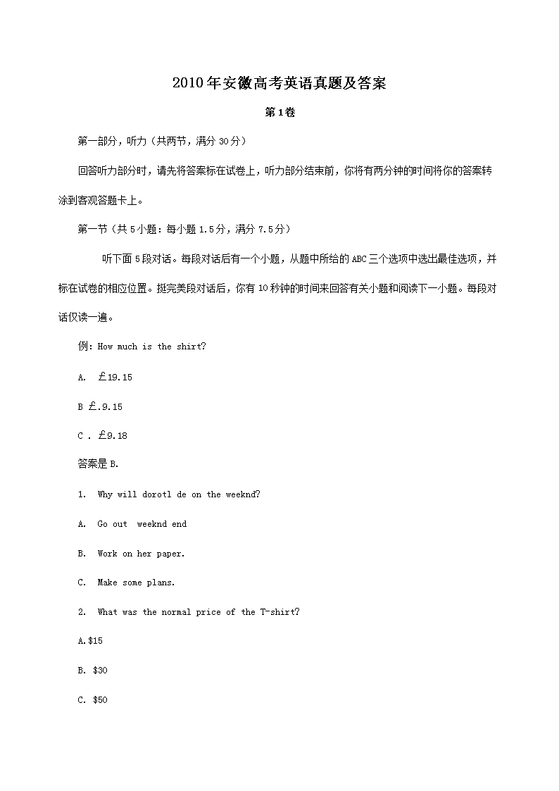 【文档预览】 无忧考网整理发布2010年安徽高考英语真题及答案(Word版),前五页预览如下:
