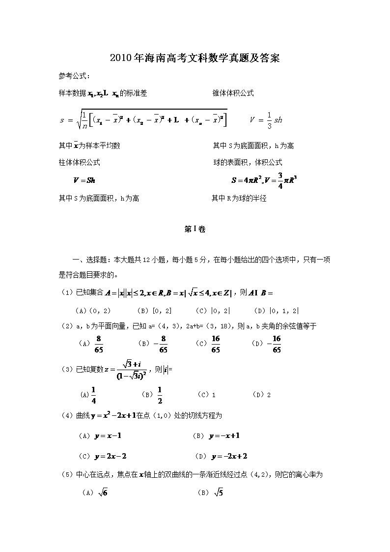 【文档名称】 2010年海南高考文科数学真题及答案(Word版).doc