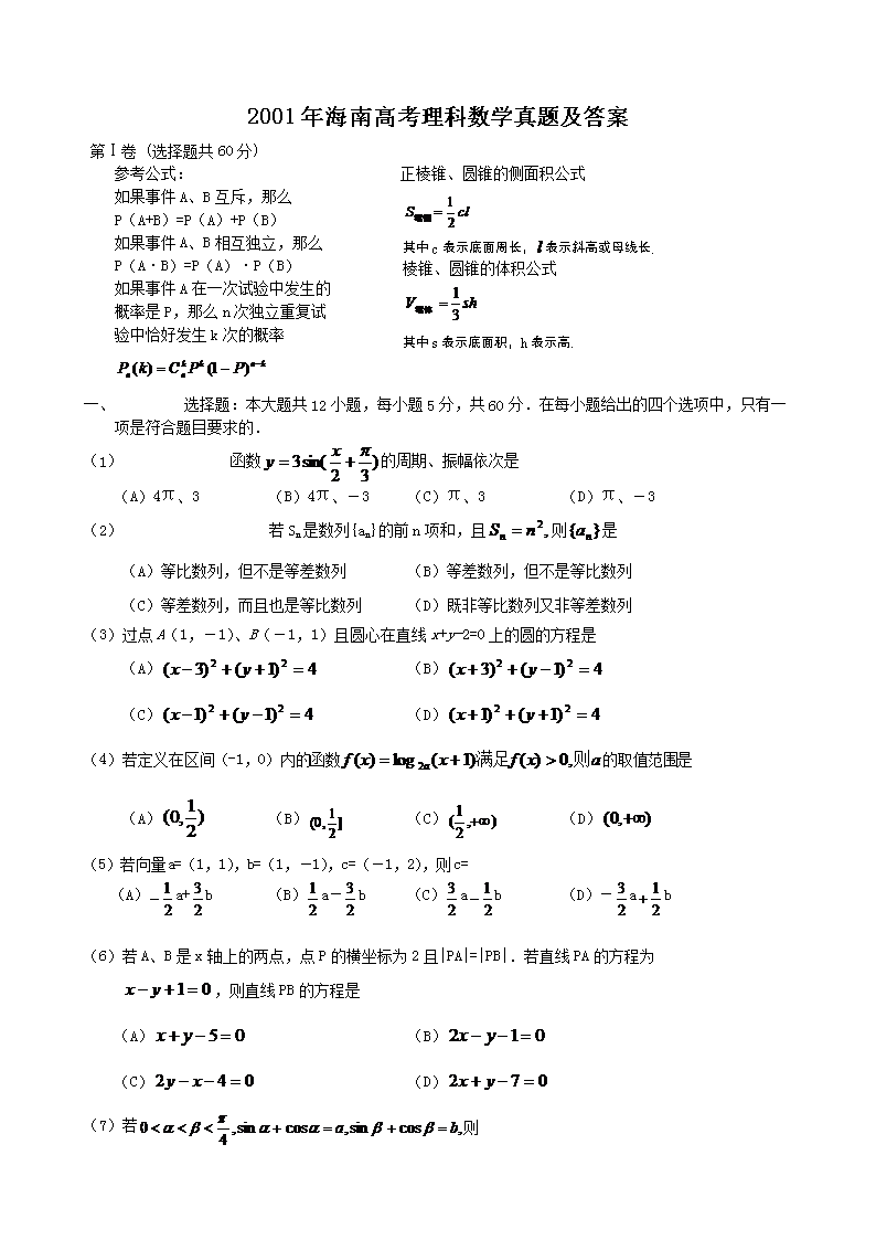 【文档名称】 2001年海南高考理科数学真题及答案(Word版).doc