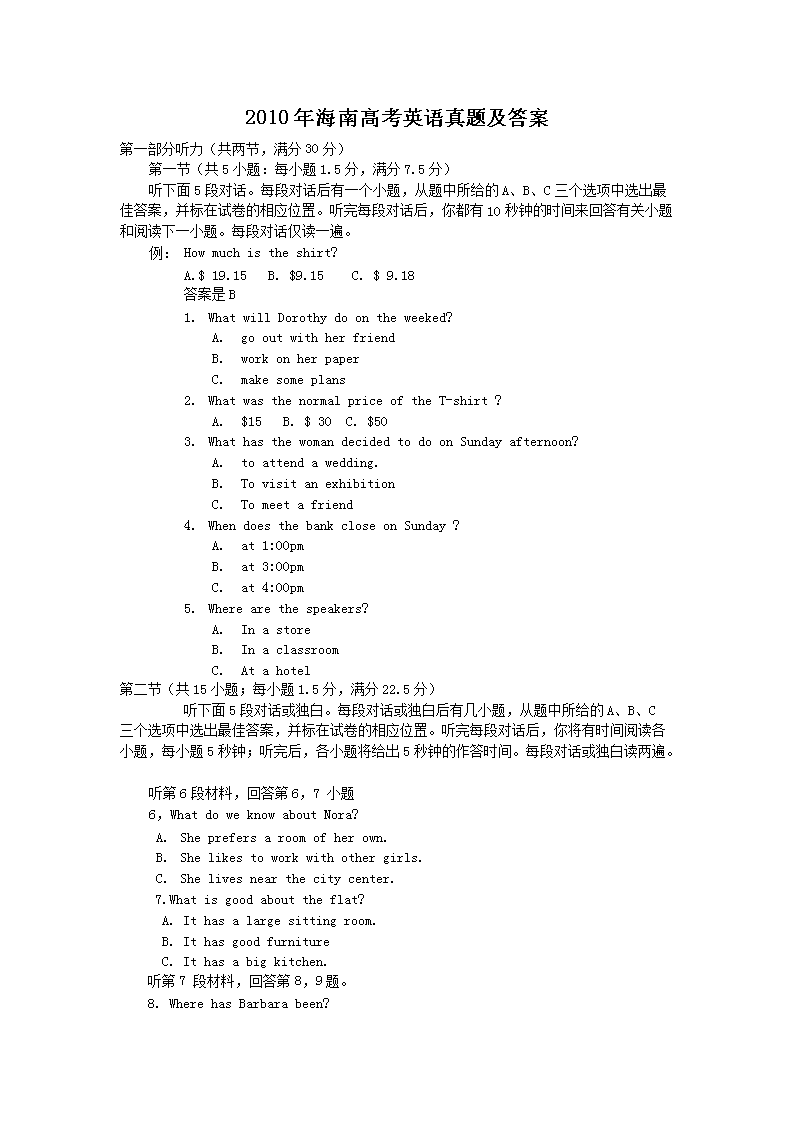 【文档预览】 无忧考网整理发布2010年海南高考英语真题及答案(Word版),前五页预览如下: