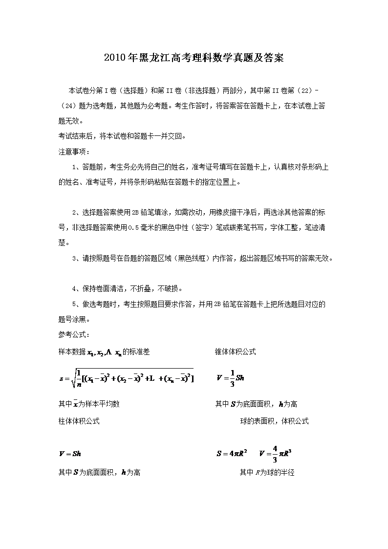 【文档名称】 2010年黑龙江高考理科数学真题及答案(Word版).doc