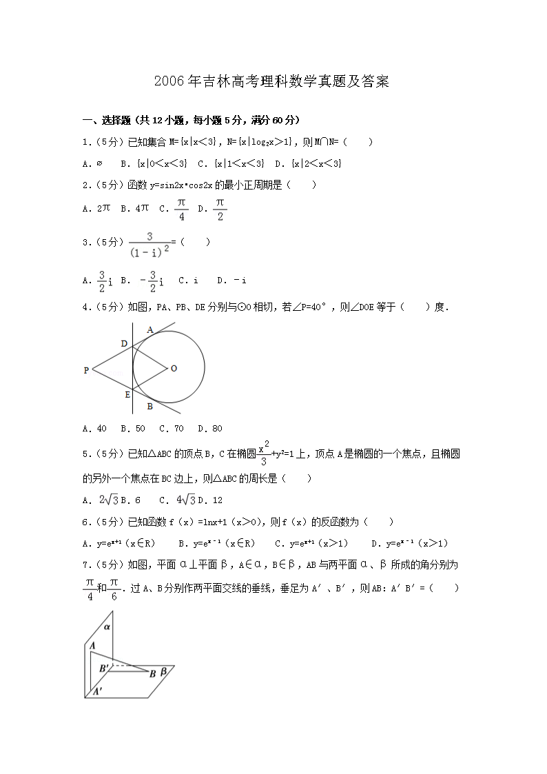 【文档名称】 2006年吉林高考理科数学真题及答案(Word版).doc