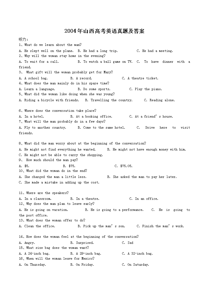 【文档名称】 2004年山西高考英语真题及答案(Word版).doc