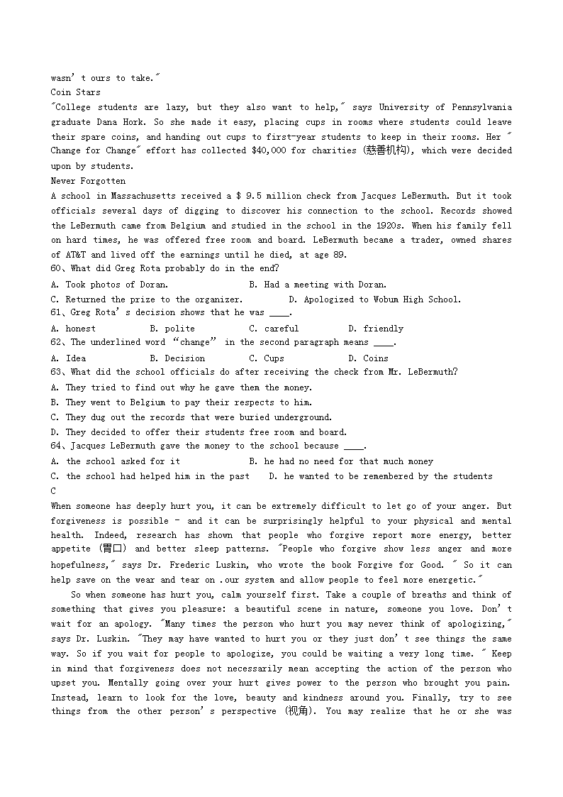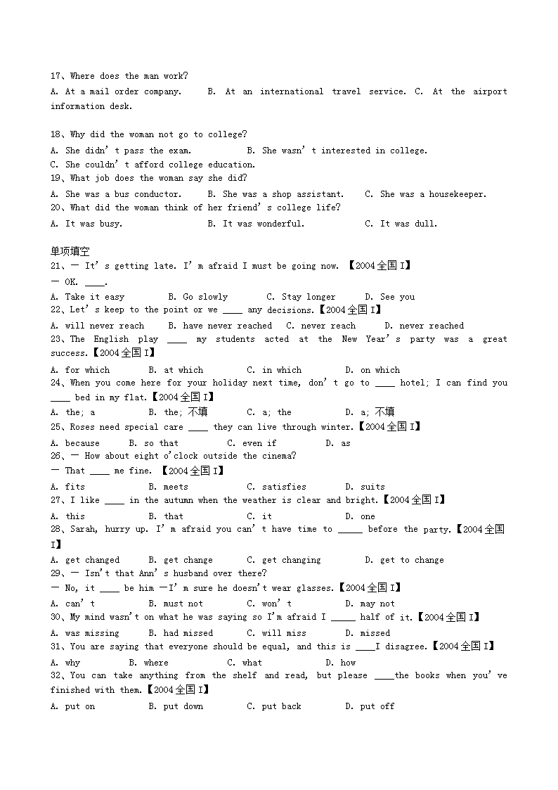【文档预览】 无忧考网整理发布2004年山西高考英语真题及答案(Word版),前五页预览如下: