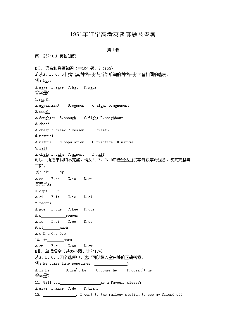 【文档名称】 1991年辽宁高考英语真题及答案(Word版).doc