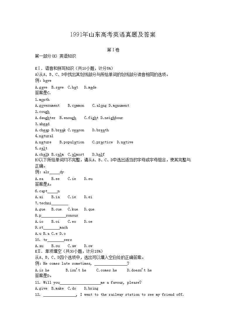 【文档名称】 1991年山东高考英语真题及答案(Word版).doc