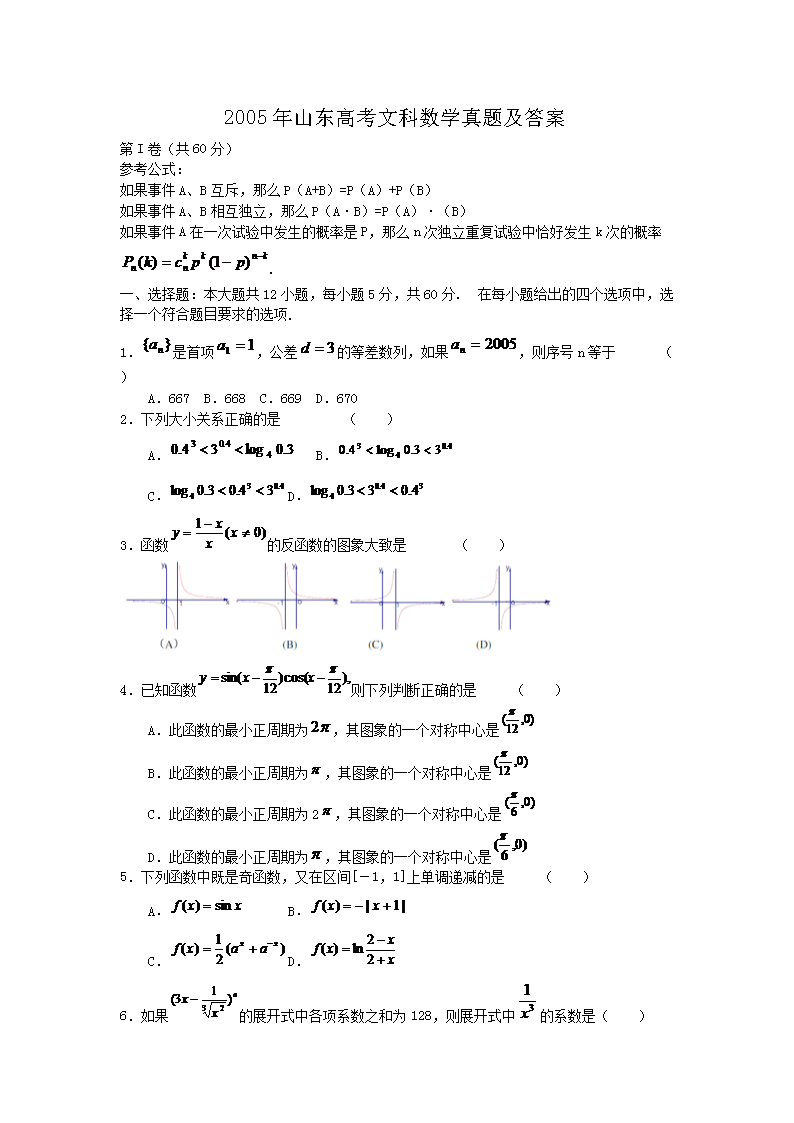 【文档名称】 2005年山东高考文科数学真题及答案(Word版).doc