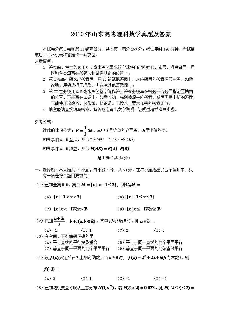 【文档名称】 2010年山东高考理科数学真题及答案(Word版).doc