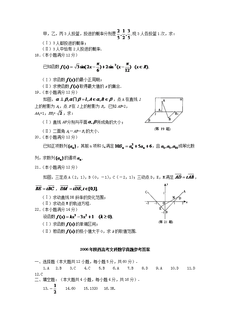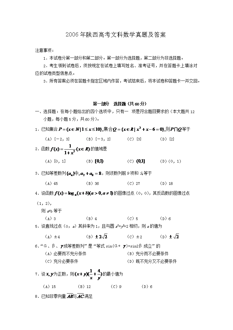 【文档名称】 2006年陕西高考文科数学真题及答案(Word版).doc