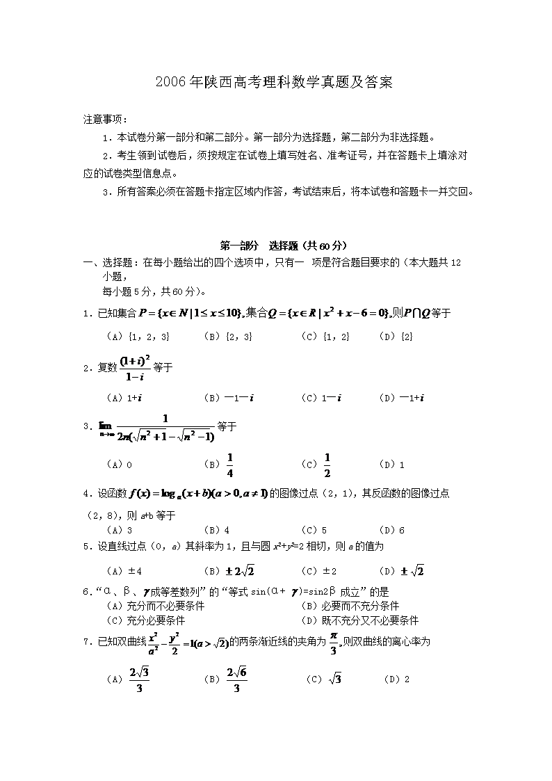 【文档名称】 2006年陕西高考理科数学真题及答案(Word版).doc