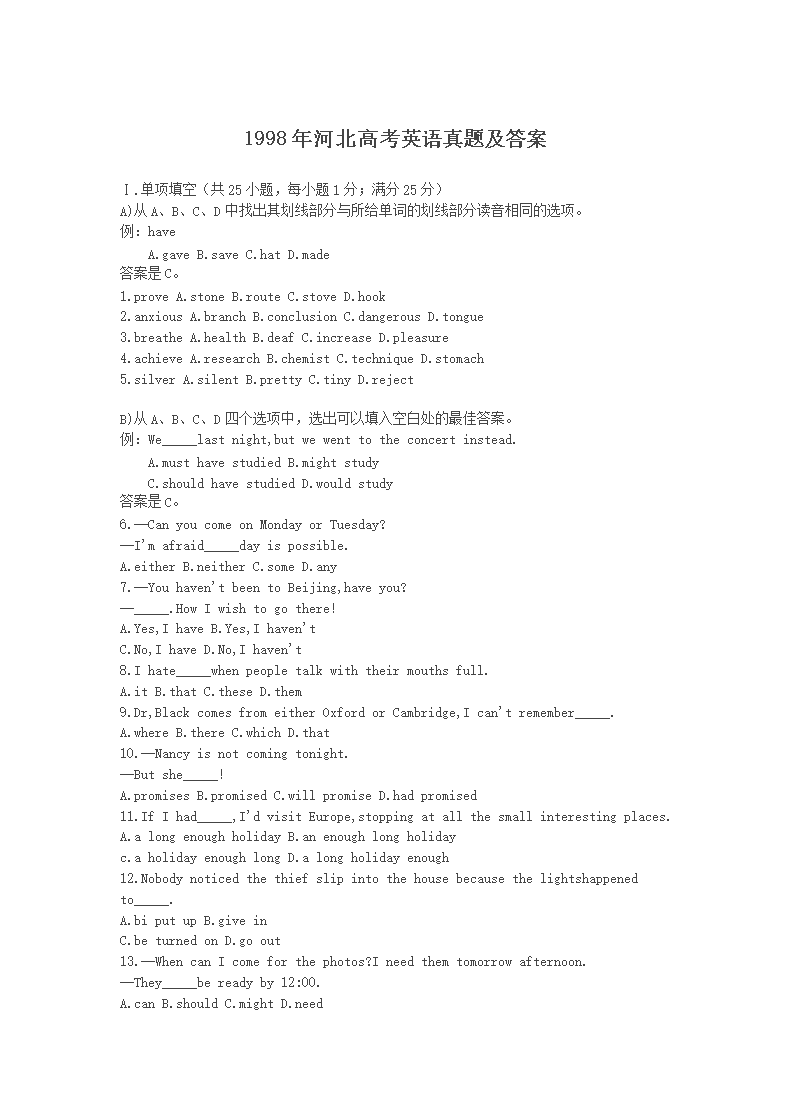 【文档名称】 1998年河北高考英语真题及答案(Word版).doc