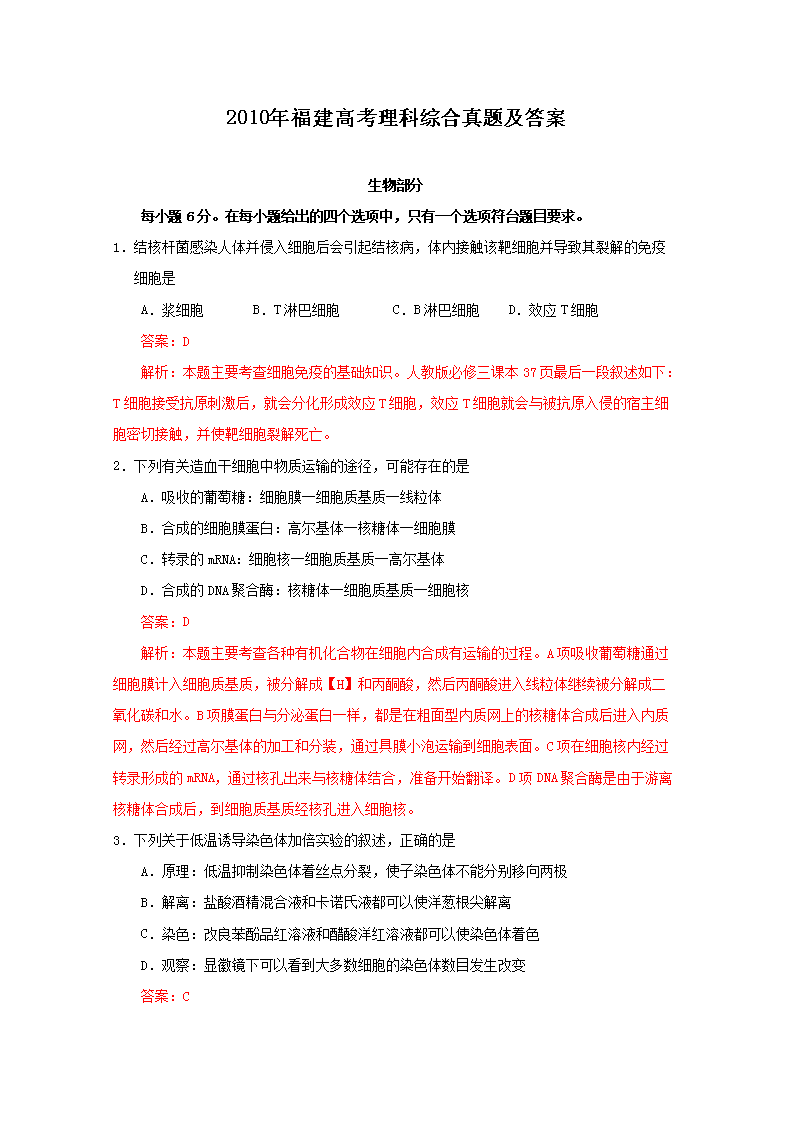 【文档预览】 无忧考网整理发布2010年福建高考理科综合真题及答案(Word版),前五页预览如下: