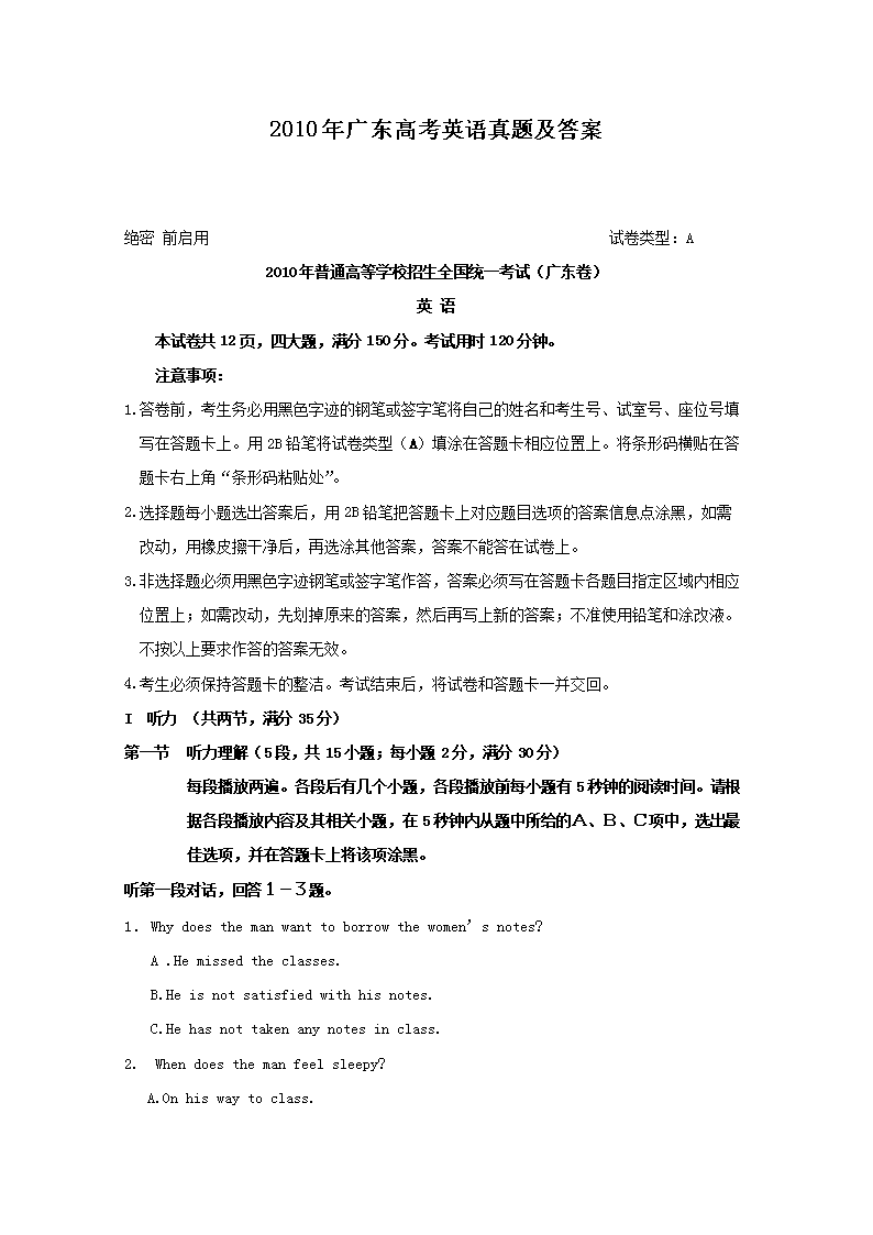 【文档名称】 2010年广东高考英语真题及答案(Word版).doc