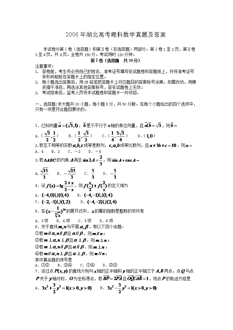 【文档名称】 2006年湖北高考理科数学真题及答案(Word版).doc