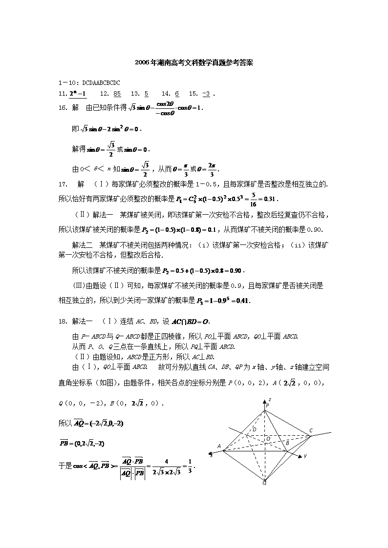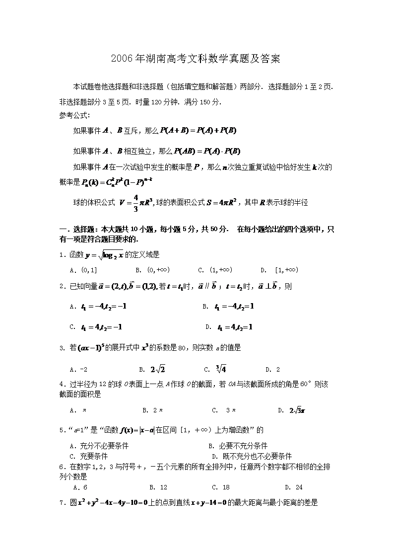 【文档名称】 2006年湖南高考文科数学真题及答案(Word版).doc