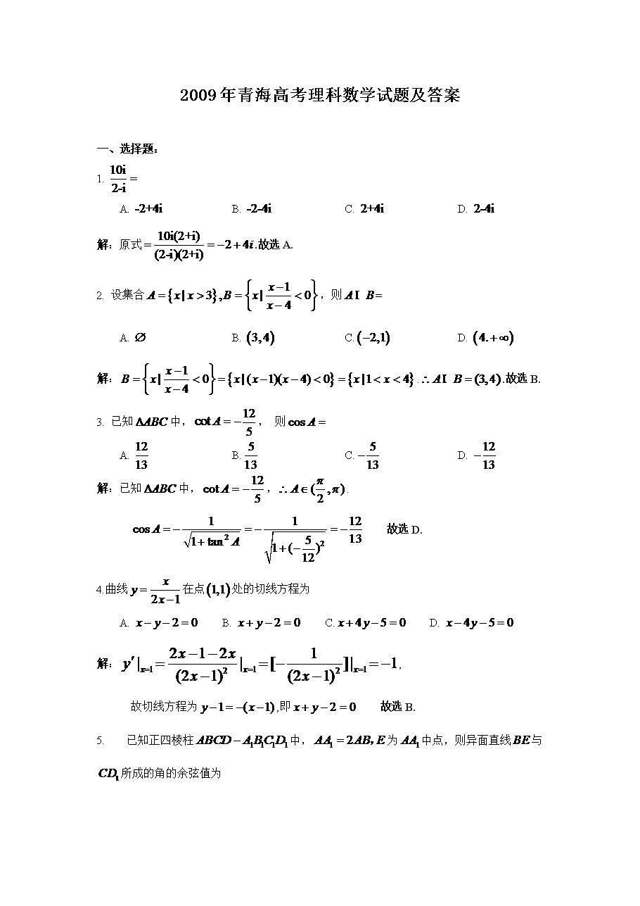 【文档名称】 2009年青海高考理科数学试题及答案(Word版).doc