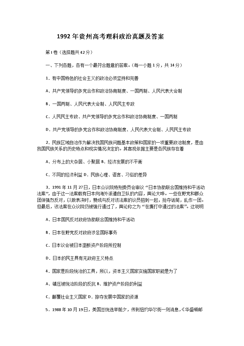 【文档名称】 1992年贵州高考理科政治真题及答案(Word版).doc