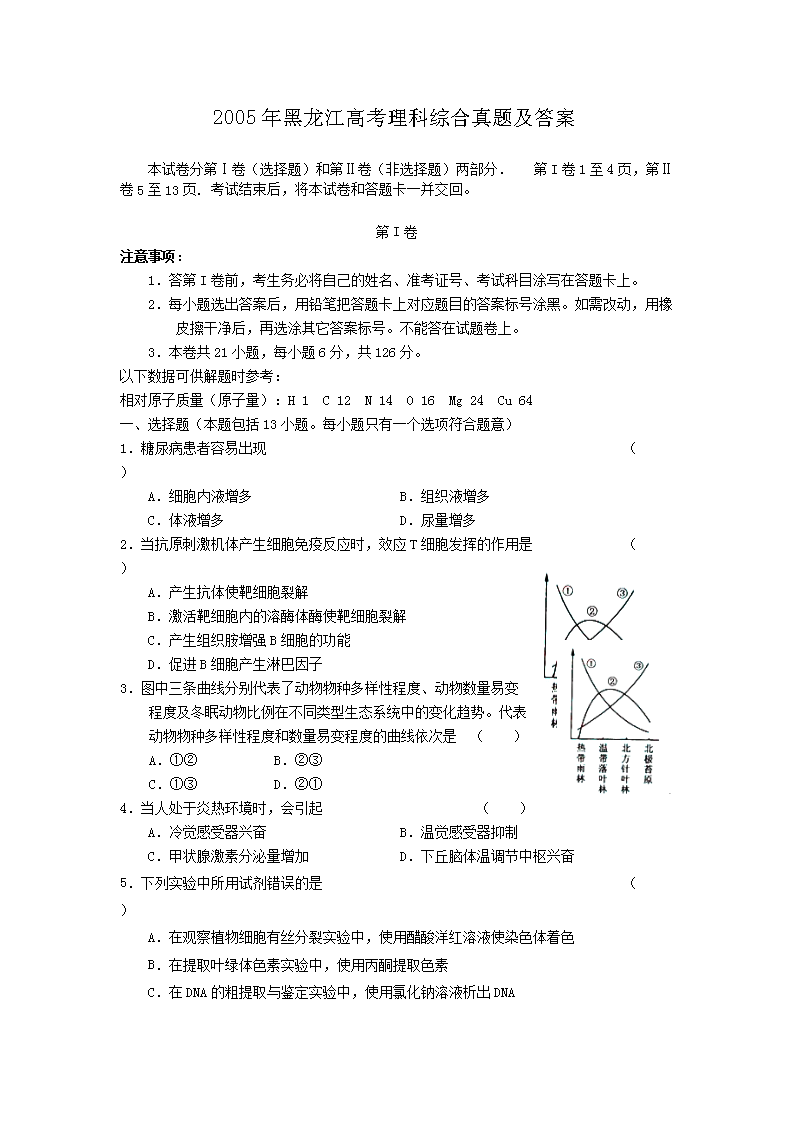 【文档名称】 2005年黑龙江高考理科综合真题及答案(Word版).doc