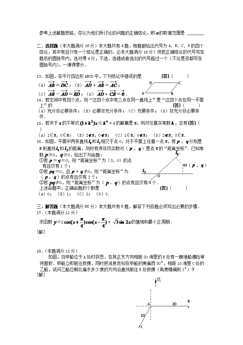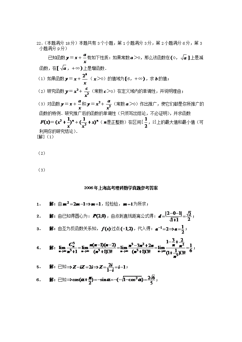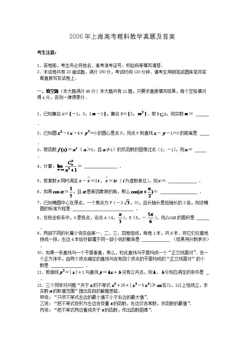 【文档名称】 2006年上海高考理科数学真题及答案(Word版).doc