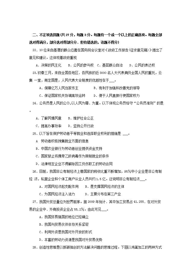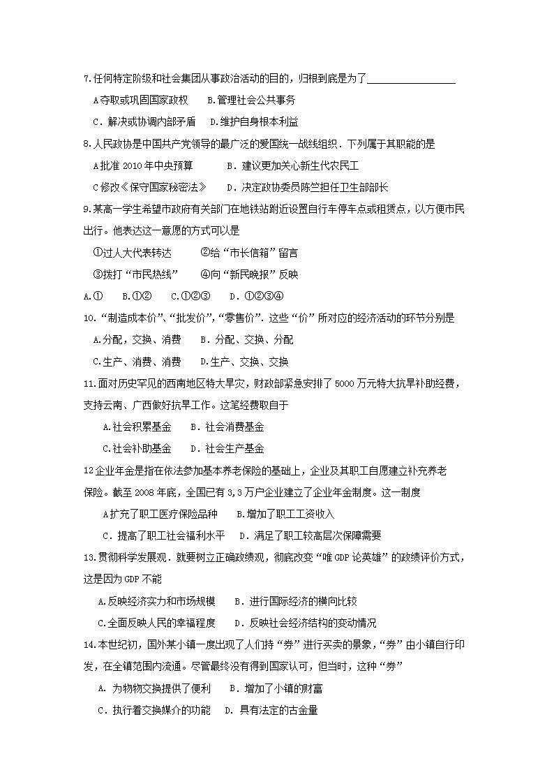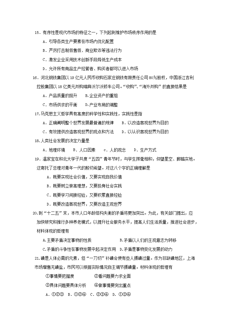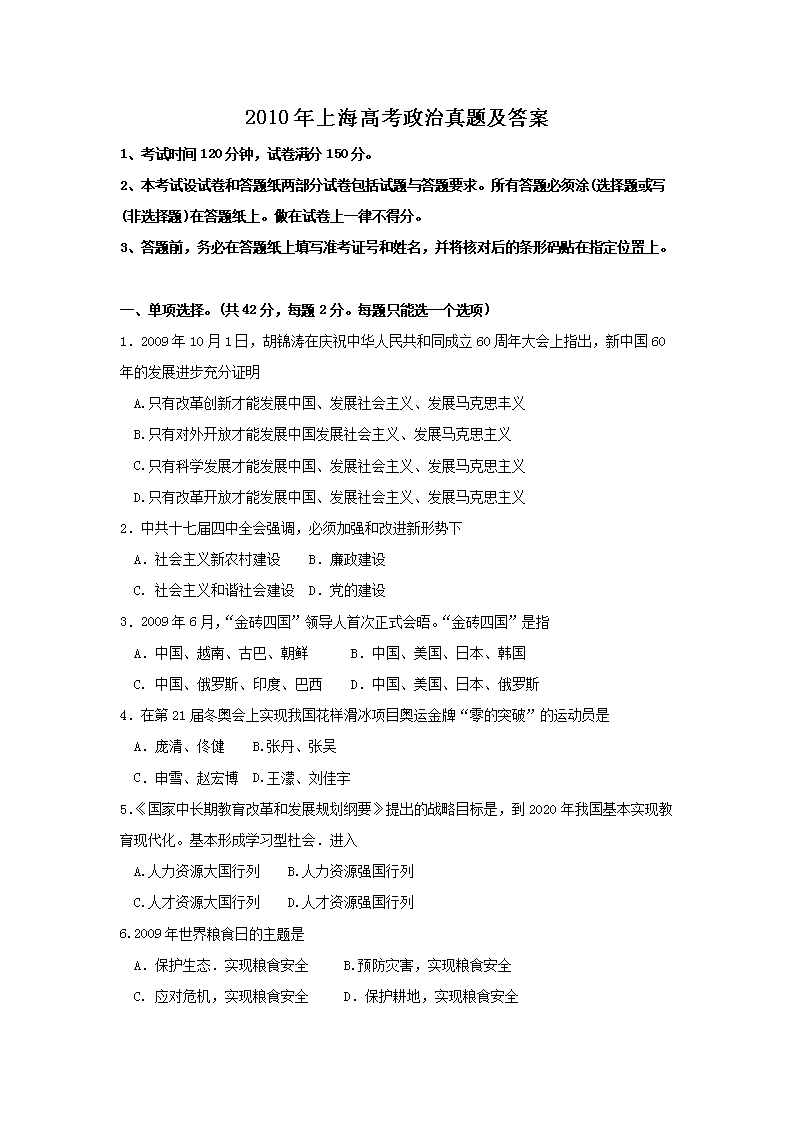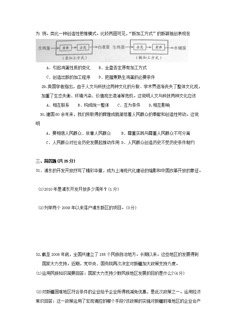 【文档名称】 2010年上海高考政治真题及答案(Word版).doc
