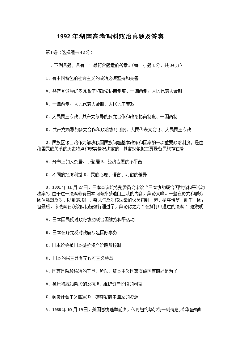 【文档预览】 无忧考网整理发布1992年湖南高考理科政治真题及答案(Word版),前五页预览如下:
