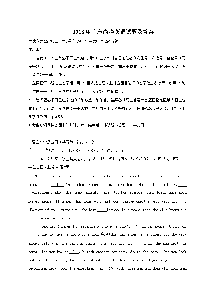 【文档名称】 2013年广东高考英语试题及答案(Word版).doc