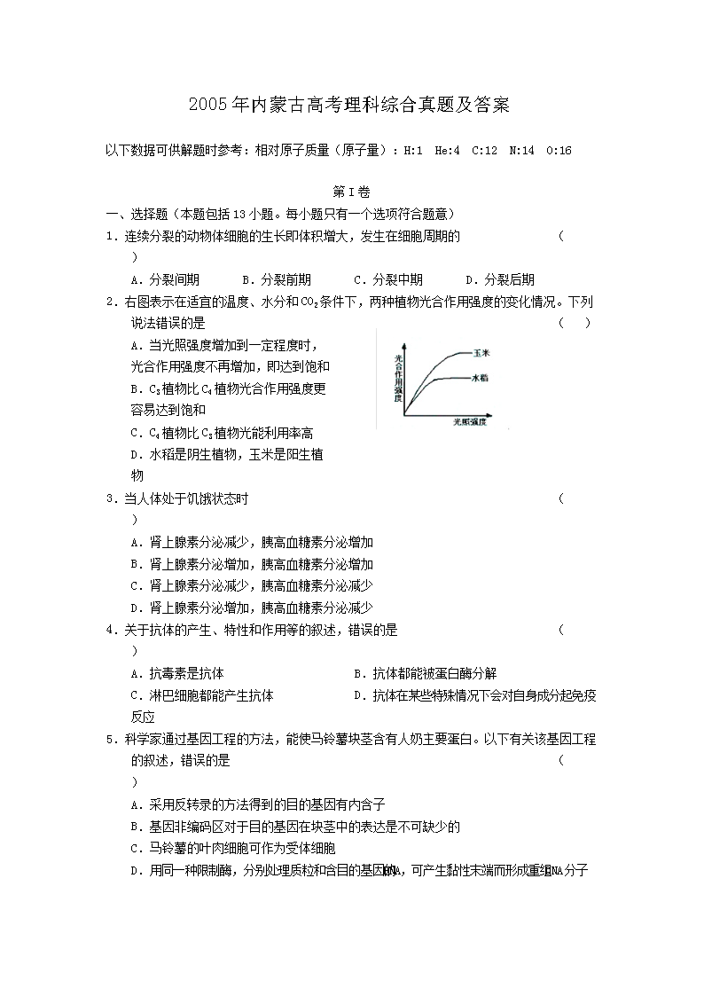 【文档名称】 2005年内蒙古高考理科综合真题及答案(Word版).doc