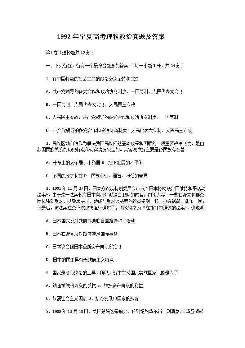 【文档预览】 无忧考网整理发布1992年宁夏高考理科政治真题及答案(Word版),前五页预览如下: