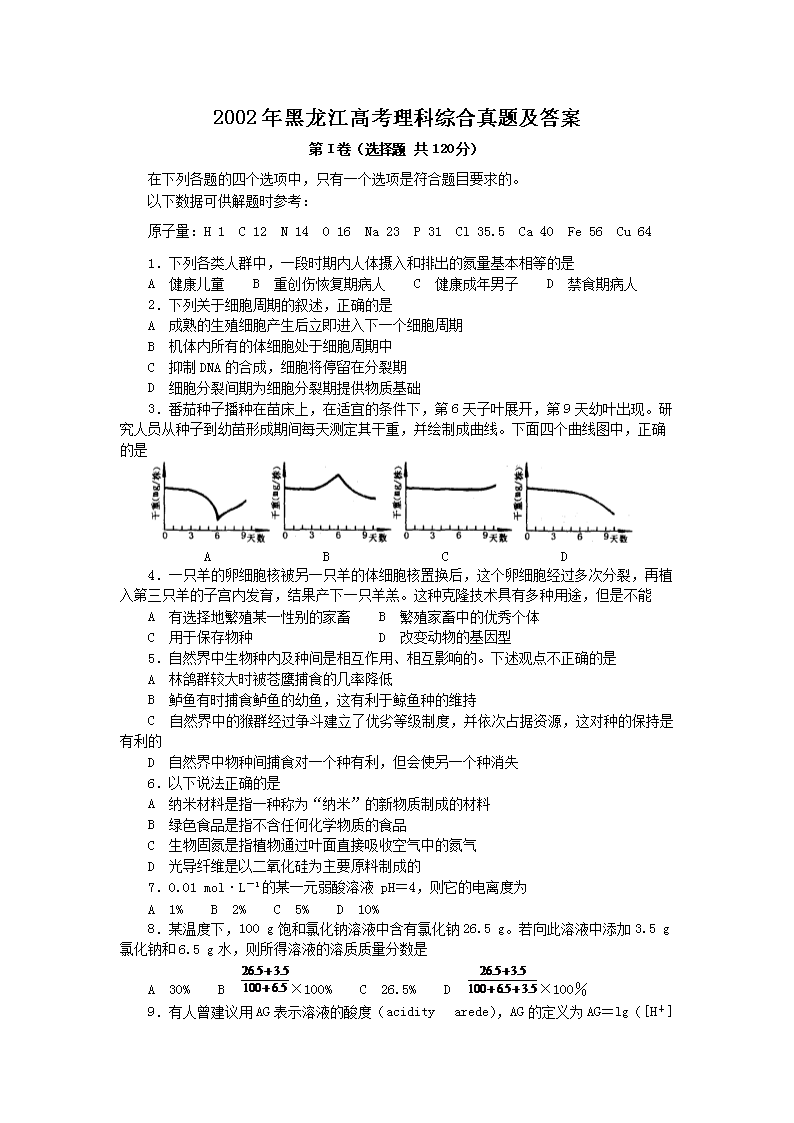 【文档名称】 2002年黑龙江高考理科综合真题及答案(Word版).doc