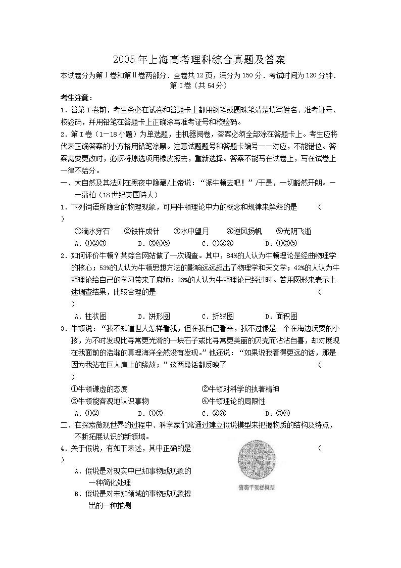 【文档名称】 2005年上海高考理科综合真题及答案(Word版).doc
