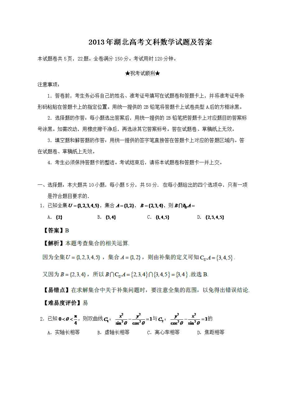 【文档名称】 2013年湖北高考文科数学试题及答案(Word版).doc