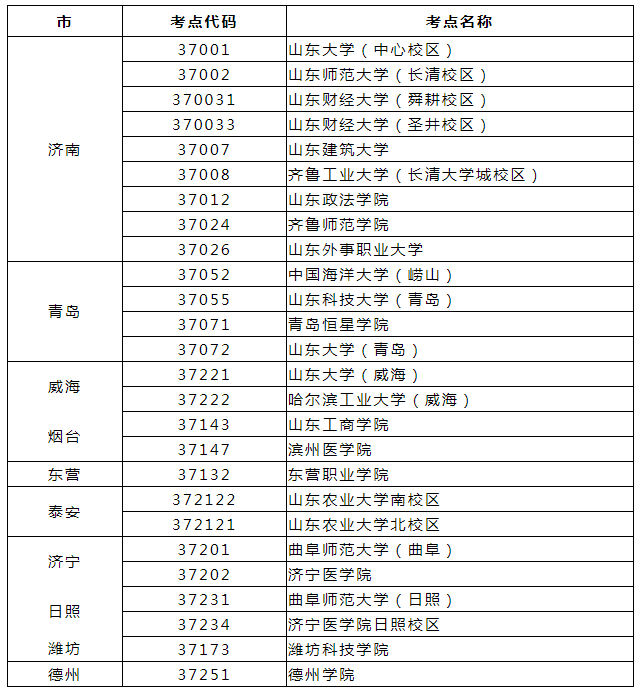 全国大学英语四、六级考试口试(CET-SET)山东省考点名单