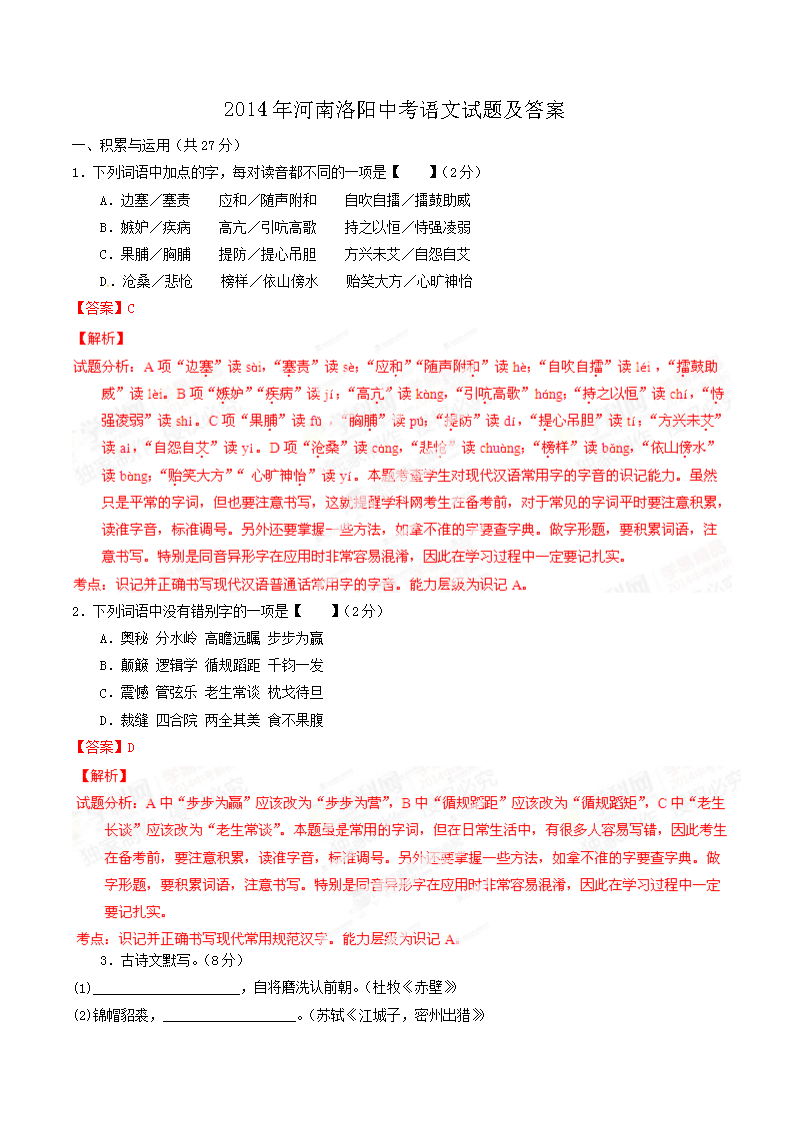 【文档名称】 2014年河南洛阳中考语文试题及答案(Word版).doc