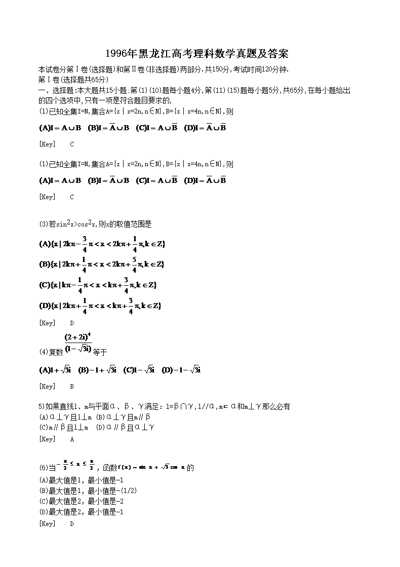 【文档预览】 无忧考网整理发布1996年黑龙江高考理科数学真题及答案(Word版),前五页预览如下: