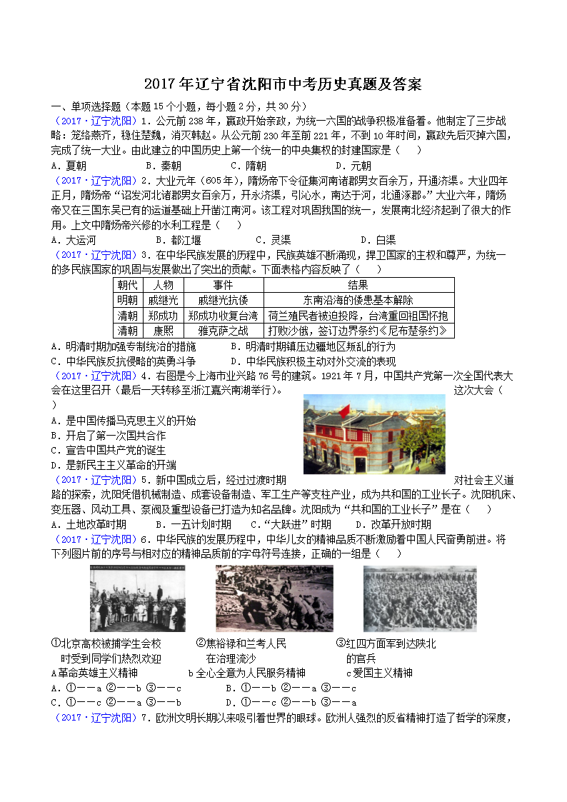 【文档预览】 无忧考网整理发布2017年辽宁省沈阳市中考历史真题及答案(Word版),前五页预览如下: