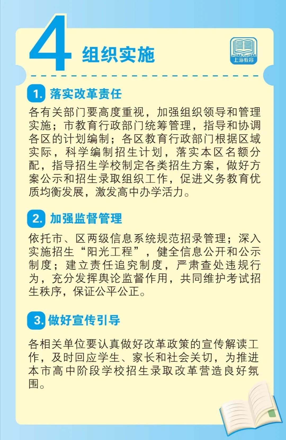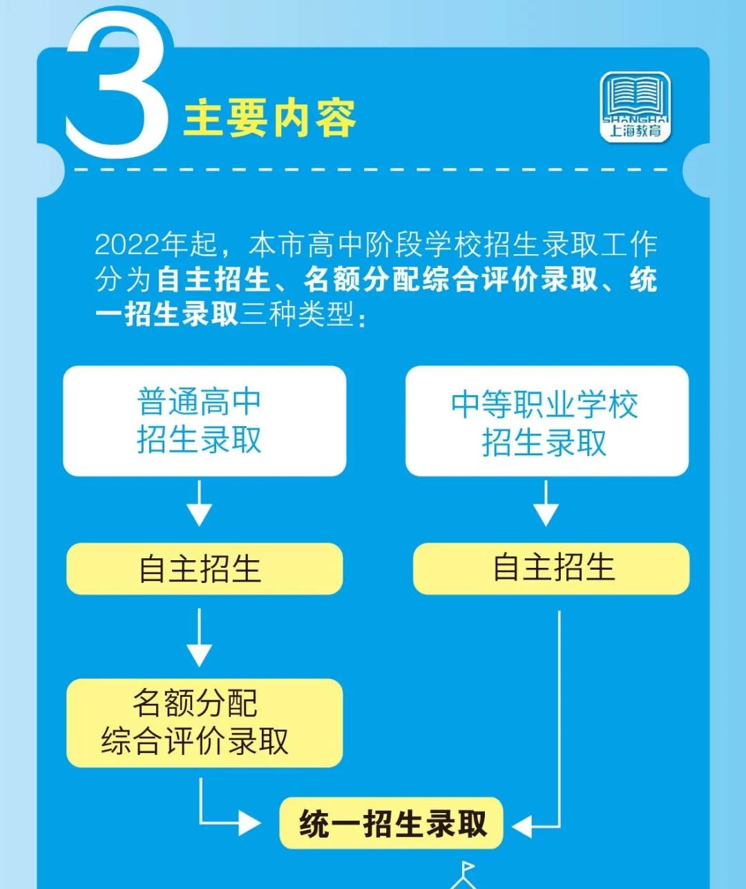 忧考网上海中考频道了解到,3月16日,上海市教委公布了《上海市高中阶段学校招生录取改革实施办法》,从2022年起,上海市高中阶段学校招生录取工作分为自主招生录取、名额分配综合评价录取和统一招生录取三种类型。最新公布的《实施办法》进一步细化了自主招生比例、名额分配方式、综合评价录取程序等内容。为方便考生了解具体情况,现将2021上海中考改革方案图解整理如下: