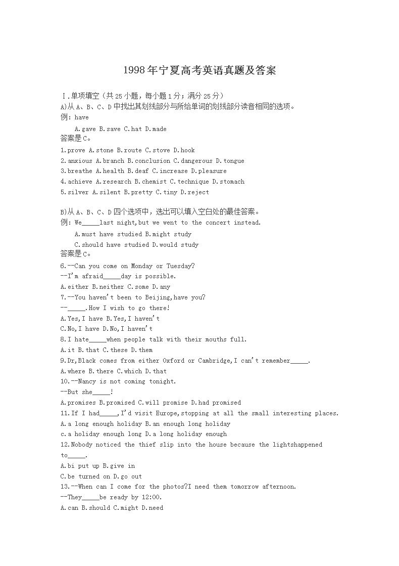 【文档名称】 1998年宁夏高考英语真题及答案(Word版).doc