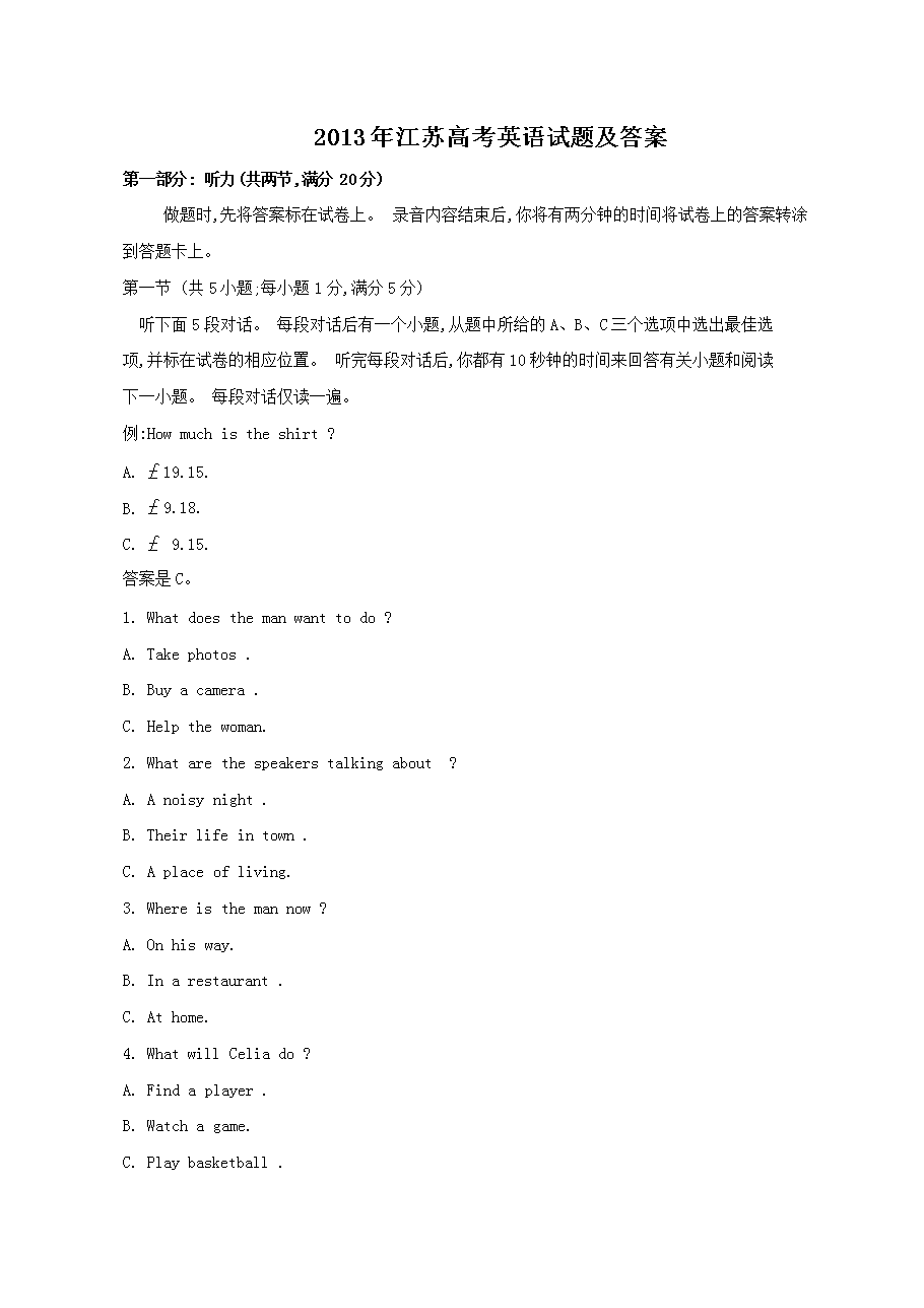 【文档名称】 2013年江苏高考英语试题及答案(Word版).doc