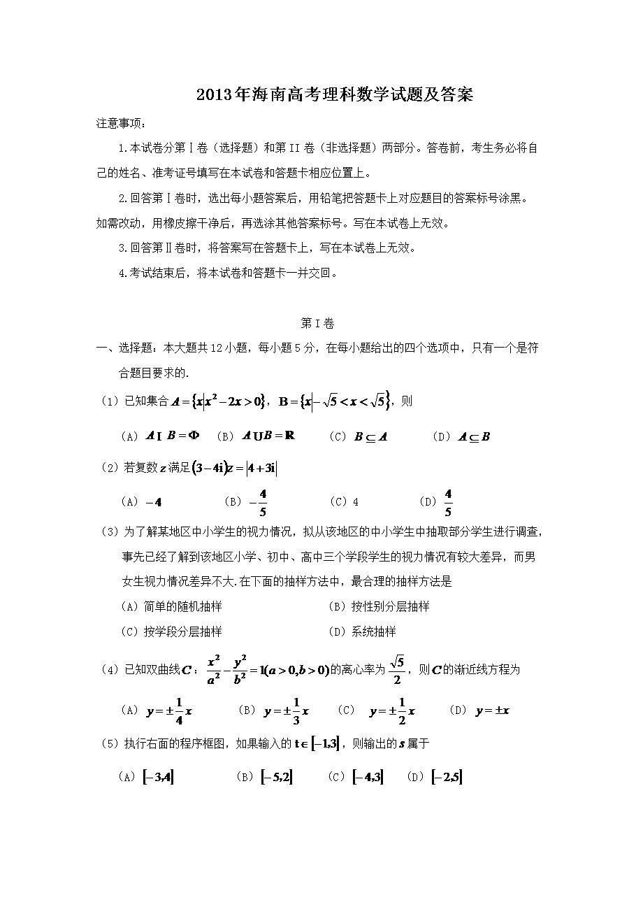 【文档名称】 2013年海南高考理科数学试题及答案(Word版).doc