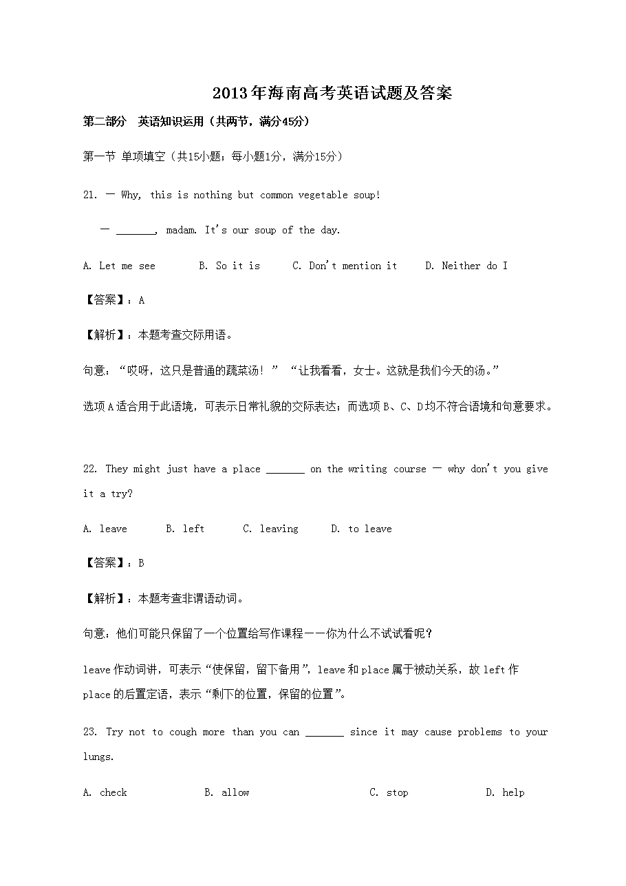 【文档名称】 2013年海南高考英语试题及答案(Word版).doc