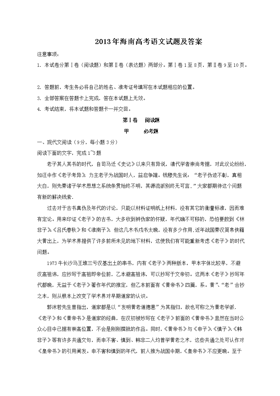 【文档名称】 2013年海南高考语文试题及答案(Word版).doc