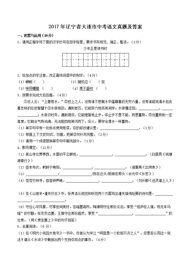 【文档名称】 2017年辽宁省大连市中考语文真题及答案(Word版).doc