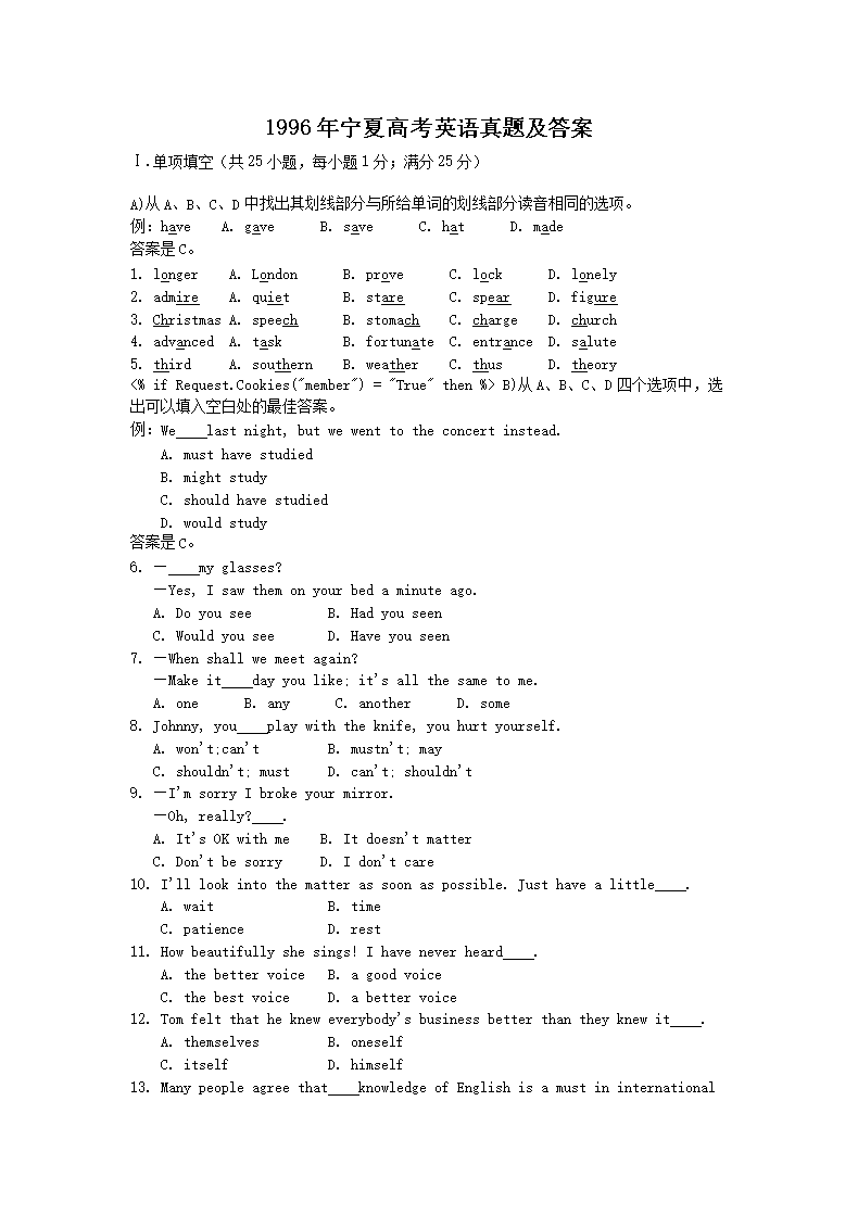 【文档名称】 1996年宁夏高考英语真题及答案(Word版).doc