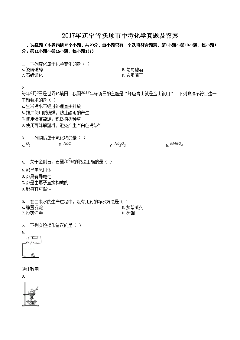 【文档预览】 无忧考网整理发布2017年辽宁省抚顺市中考化学真题及答案(Word版),前五页预览如下: